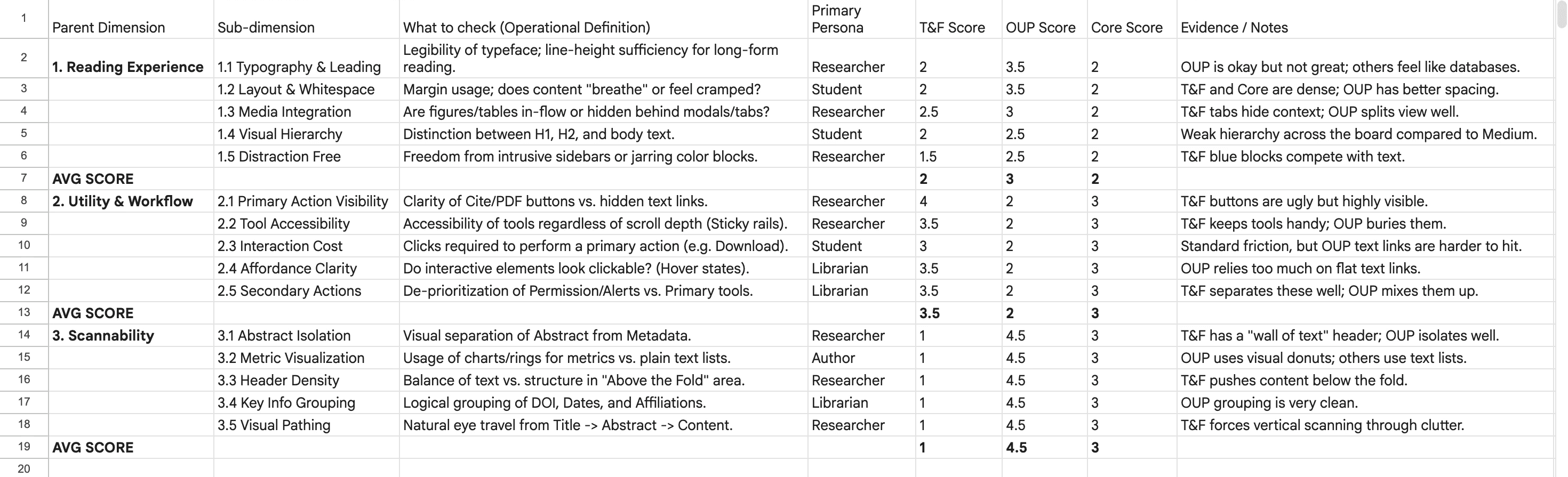 With a tight 3-week deadline, we couldn't run a full research cycle. To de-risk our design decisions, I conducted a rigorous Heuristic Evaluation against our direct competitors: Taylor & Francis (T&F), Oxford University Press (OUP), and our own Cambridge Core.